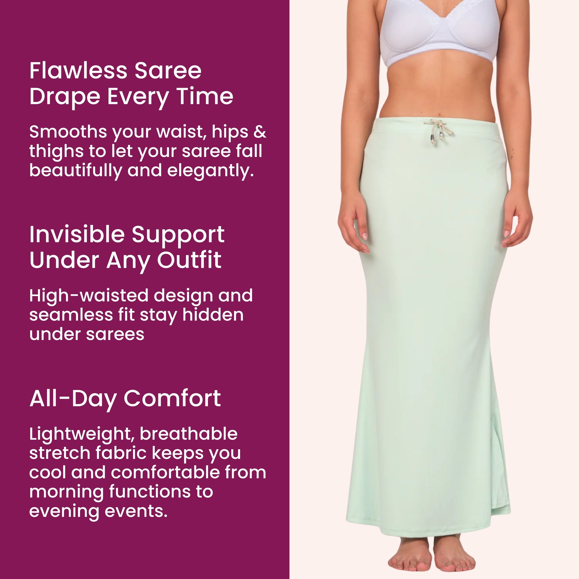 Seamless Elegance: Munns and Mars Saree Shapewear Inskirt has a seamless design for an elegant and invisible appearance under your sarees.